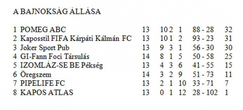 A városi kispályás labdarúgó bajnokság 14. fordulójában, a második kör befejezése után az esélyes három csapat tartózkodik a dobogón az öregfiúknál. A Joker csapata harmadszor játszik döntetlent egymásutánban, az elvesztett pontok még hiányozhatnak a végelszámolásnál.
