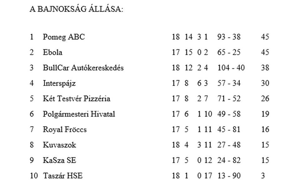 A következő forduló (05.23.) párosítása: 18.30 Interspájz-Ebola, 19.15 Royal Fröccs-KaSZa SE, 20.00 Két Testvér Pizzéria-Polgármesteri Hivatal.