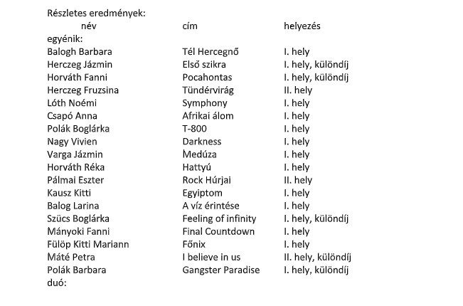 A Crystal SC versenyzői is kitettek megukért és megmutatták, hogy a szervezésen kívül a versenyen is helyt tudnak állni. Takács-Békési Zsanett munkáját a szülők segítették, hogy a szombati nap sikere ne maradjon el és a színvonal se legyen alacsonyabb, mint az elmúlt években. A Szivárvány jegyében zajló versenyen 20 db. I. helyet, 3 db. 2. helyet és 9 db különdíjat zsebeltek be a Crystal SC versenyzői.