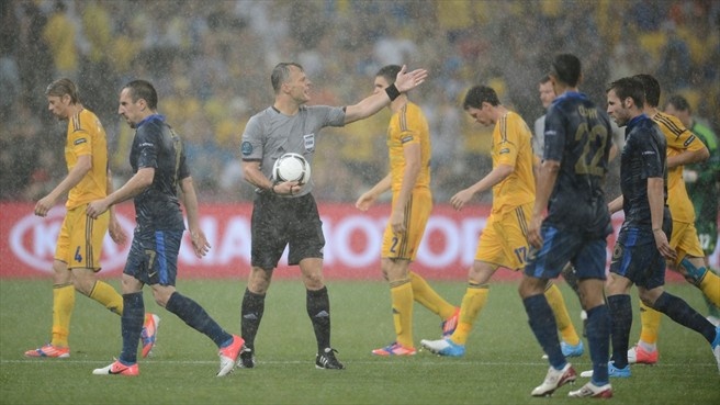 Sötét fellegek gyülekeztek a donecki aréna felett, ám a meccs időben, este 18 órakor elkezdődött. Néhány villámlás után azonban Kuipers játékvezető az öltözőbe rendelte a csapatokat. Az eső vígasztalhatatlanul ömlött, a villámok pedig nem győztek csapkodni.