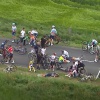 A hazai országúti kerékpárverseny csütörtöki, Veszprém és Siófok közti, második szakaszán hatalmasat bukott a mezőny eleje, több bringás is belekeveredett a tömegbalesetbe.