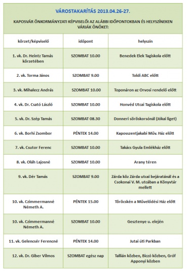 - Arra kérjük a kaposváriakat, hogy tegyenek rendet saját házuk előtt. Nyírják le a füvet, seperjék fel a járdát, a bolttulajdonosok pedig mossák le a kirakatot. Aki pedig nemcsak saját portája előtt akar rendet tenni, hanem szívén viseli egy-egy városrész sorsát, s közösségben, jó hangulatban dolgozna, az csatlakozhat az adott körzet önkormányzati képviselőjéhez. A résztvevőknek a városháza is biztosít kesztyűt, zsákot, szükséges szerszámot. A találkozási pontokat megtalálják a város honlapján és a helyi sajtóban – ismertette a részleteket Kovács Katalin, a Városháza környezetvédelmi referense.