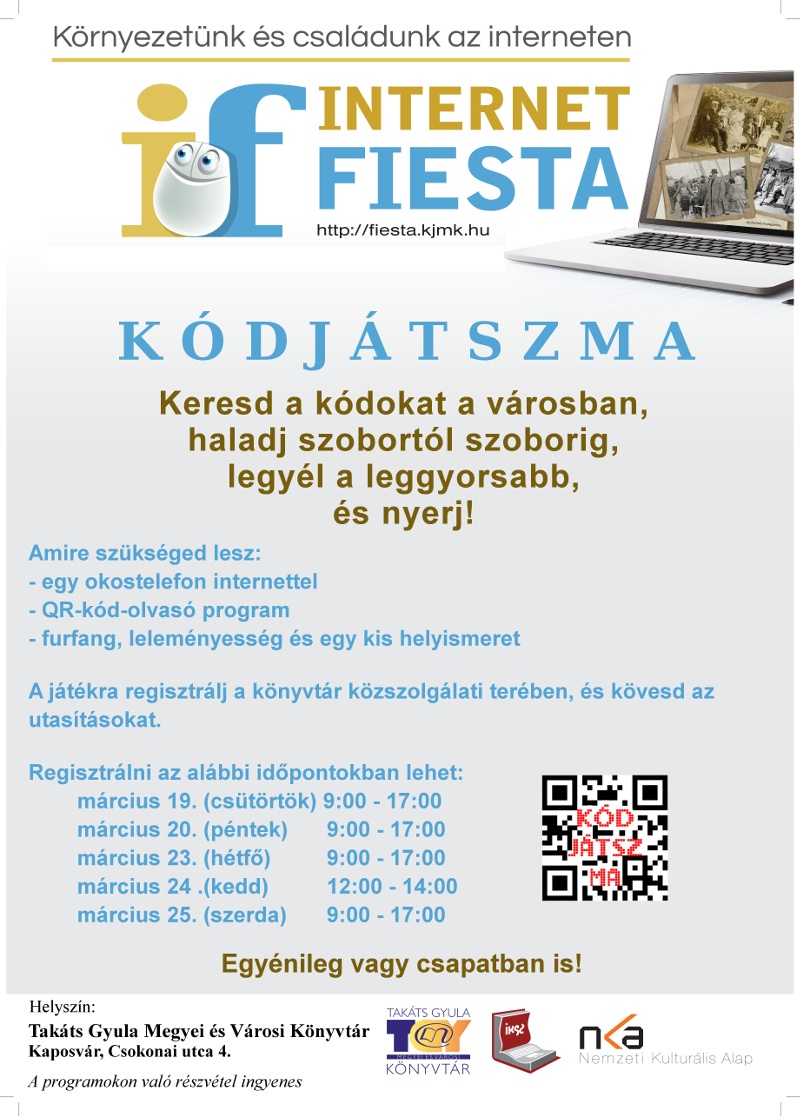 A Takáts Gyula Megyei és Városi Könyvtár idén is csatlakozott az országos Internet Fiesta programsorozathoz, melynek keretében izgalmas vetélkedőn vehetnek részt azok, akik jelentkeznek a Kódjátszmára.