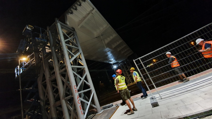 A következő időszakban a kisebb daru átemeli az egykori távolsági buszállomás helyén lévő elemet a helyi járatos pályaudvarra, ahonnan a nagy daru fogja majd a pilon és a peronon lévő segédtámaszra pakolni.