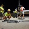 Az emelés egyik gyengje pontja, hogy a híddarab vízszintesen álljon. Ez elsőre ugyan nem sikerült, de néhány percnyi átállás és a tartósodronyok toldása után zökkenőmentesen haladt a daruzás.