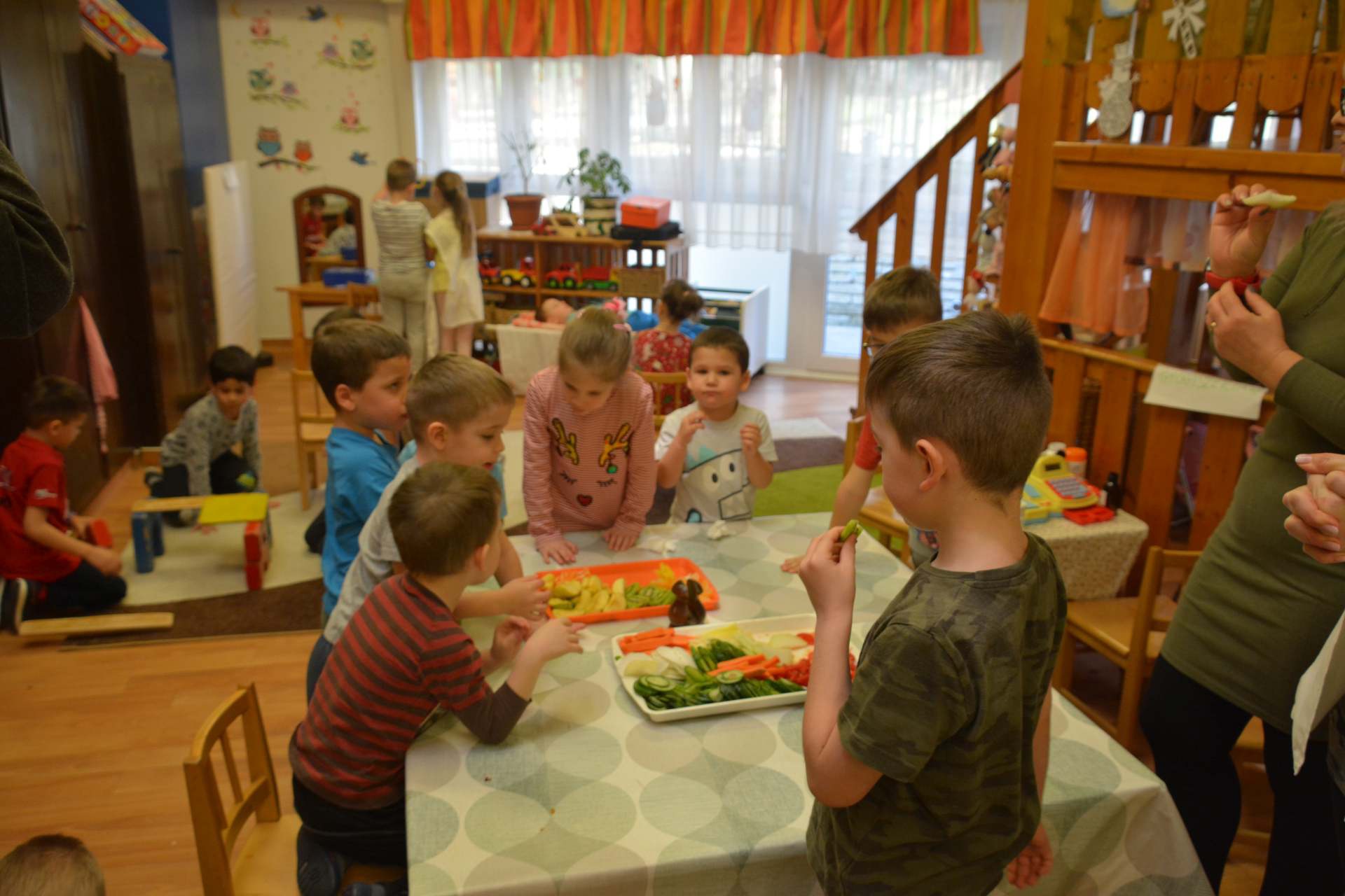 Csütörtök délelőtt a gyerekek különböző zöldségeket és gyümölcsöket kóstolhattak meg az óvodapedagógusok segítségével.